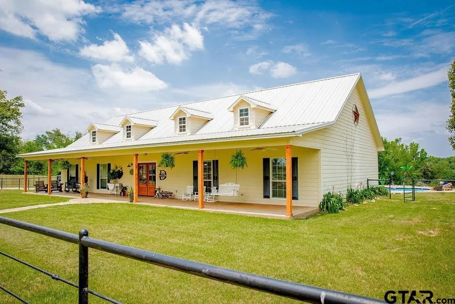 PRICE JUST REDUCED!! Stunning Country Showplace!! Enter this beautiful 15+ acre property thru a gated entrance. Upon entry, you will see a 3,000 SF Barndominium with a 1,200 SF apartment with Living/Dining/Kitchen combo, and woodburning fireplace. Two bedrooms with cedar lined closets and 1 1/2 baths complete this rustic space.The remainder of Barndominium is 2000 SF of space to use as you choose. Has three 14 foot overhead doors, overhead storage, spray foam insulation, multiple electrical outlets, and a half bath. Just past Barndominium you will see the wonderful farmhouse. A true Southern beauty with Pecan orchard in front and a huge covered front porch with columns. Upon entering the house, you will be welcomed by a Living/Dining/Kitchen combo. The kitchen is a Chef's dream with 2 ovens, microwave convection oven, range, dishwasher, farmhouse sink, granite countertops, huge Island, and large cedar pantry. Living/Dining has tongue and groove cathedral ceiling and beautiful woodburning fireplace. Home boasts 3 BR, with Master separated from secondary bedrooms. The Master is huge with tray ceiling and has attached Master Bath entered thru Barn doors. Bath has unique wood countertops, large shower, and walk in closet. Other 2 BR share a bath with shower and dressing area. Both have closets with built in chests. There is a home office with raised ceiling, built in desk and lots of storage. An extra large Laundry Room has sink, storage closet and built ins. Cement floors thruout for easy maintenance, plus ceiling fans thruout. Foam insulation sprayed in attic. Outside you will find a beautiful covered deck with new gunite pool with soothing fountain. The house is powered by Solar Panels, electric bills very low! Property completely fenced with Pipe and Wood. Ag Exempt/Hay. A lot of Love and Care went into the planning of this property!! Come fall in love with this beautiful home!