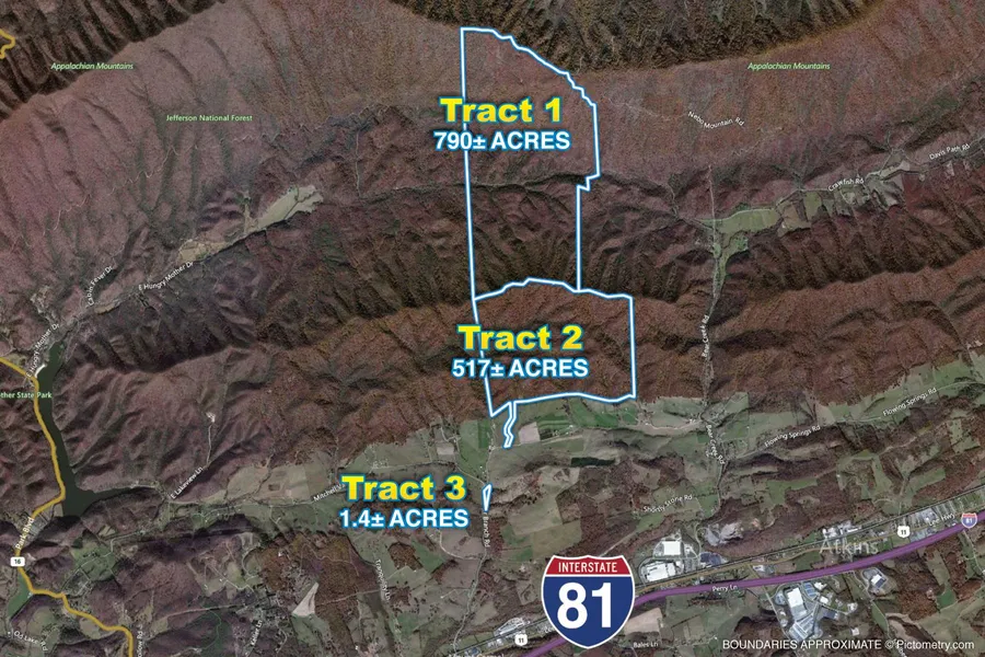 Research Parcel InformationFrom I-81 take Exit 47(Marion), follow Rifton Drive to Hwy. 11. Turn right onto Hwy. 11 North. Go 2.1 miles. Turn left onto Bear Creek Rd. Go 3 miles, and continue straight on Nebo Mountian Rd. Go 2.8 miles to gates on left.