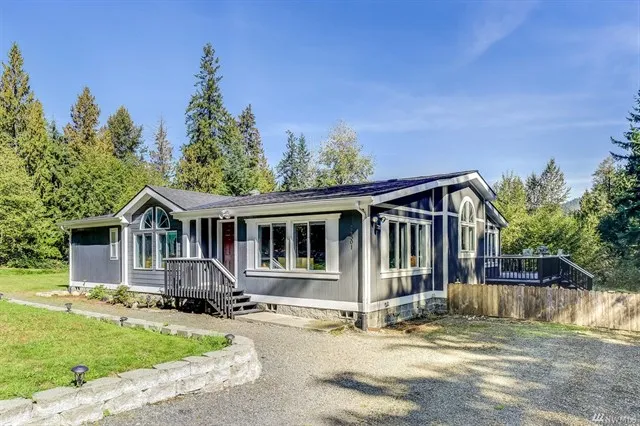 5+ acres w/1920 SF home built in 2000 featuring spacious rooms, new flooring, huge deck, 2 car 30X20 garage/shop w/10 foot doors, 4 stall barn, 5 ton hay container, partially fenced, mostly level land. Ready for your horses, goats, cows,chickens, etc! Secluded! Nine+ ft vaulted ceilings live large, great room w/pellet stove, dining room & breakfast nook, open kitchen, master w/spacious bath & soaking tub, 2 more bedrooms, full bath, + den off the front entry, skylights. Enjoy riding trails too!