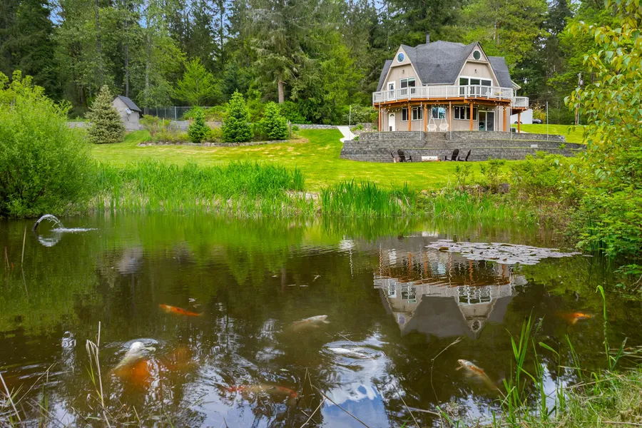 A peaceful retreat from the city, this geodesic home is situated on 5 acres. Soaring ceilings upon entry & natural light throughout, new carpet & LVP, fresh interior paint, new plumbing, new hot water tank, A/C, 40x60 dog run, new bathroom, just stained cedar decks, & newer Milgard windows. Primary suite loft has a walk-in closet & bathroom. Daylight basement has newly installed 12 ft. Andersen slider & space to finish to your liking. Park-like setting w. a massive fully stocked natural koi pond, Asian pear tree, 2 Chestnut trees, garden w. blueberries, gunnera plant, Nobel fir trees, roses, & space to roam. Ample parking for 8+ cars, detached 30x30 shop w. 100 amps & covered RV parking. Perfect work from home oasis with great wifi service!