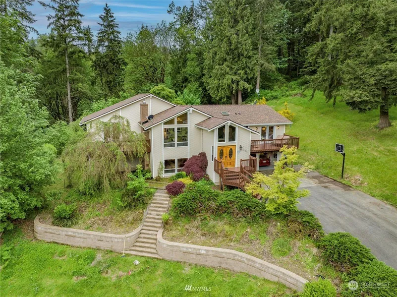 Stunning equestrian estate set on 5 private acres with views of mountains and trees! 2 stall barn with power/water, Koi pond, outdoor riding arena and upper/lower pastures for the horses. Remodeled kitchen with maple cabinets and gorgeous slab granite. Vaulted ceilings, large picture windows, wood beams, and multiple view decks in the front/back. The major items already done like new roof, gutters, paint, decks. Remodeled bathrooms have the spa-like jetted tub, amazing triple shower heads, and new vanities. Lower level has wood accented walls/ceilings and a 2nd fireplace. Geothermal heat & air conditioning keeps your bills down. Garage has epoxy floors and extra spot perfect for a shop! 1 mile to Woodinville and just a few miles to Redmond.