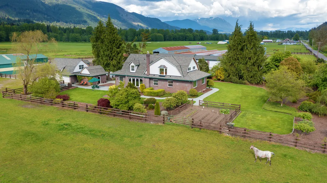 Rarely does a property such as this become available. Rengen Ranch is a majestic, peaceful 200+ acre estate with over 1.7 miles of glorious PRIVATE low bank Stillaguamish River frontage. Located moments from Arlington, this extraordinary property blends old world charm with Montana vibes, offering every amenity imaginable. The Living Spaces ~ A Classic brick Colonial 2 Story home featuring exceptional finishes and copious living space boasting 4 spacious bedrooms including 2 primary en-suites AND a fully equipped 1 bedroom/1 bathroom 1800 sq. ft. detached ADU. Gallop through lush pastures and flat winding trails along the river to one of many sandy beaches on your PRIVATE RIVERFRONT. Swim, float ,picnic, fish, watch eagles soar, Relax while you soak up the sun, gaze at the stars around the bon-fire. Private pond for excellent duck hunting. For the Equestrian ~ 165'x140' outdoor arena, 75'x50' indoor arena, 2 barns, 7 stalls with run-ins (room to add more), heated tack room, heated wash rack and multiple pastures with trails throughout the property. 160+ acres of Orchard Grass Hay. Originally a dairy farm, this ranch is still blessed with the authenticity of original barns and offers multiple outbuildings including 3 garages showcasing an enormous 10+auto garage for the car enthusiast, 2 car garage with loft/office space and canning room, huge 10,000+ sq. ft. shop, covered RV/Trailer storage. 2 - 6000 sq. ft. hay barns, 450+ cattle lay stalls and much more. Plenty of room to visit via helicopter or plane. Endless opportunities await. Welcome to Paradise.