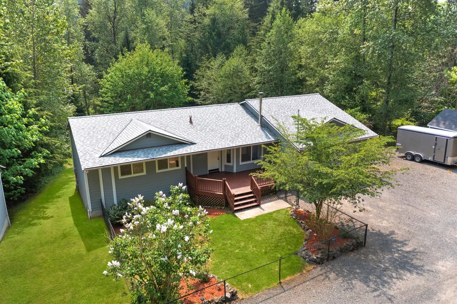 [WOODS CREEK RAMBLER W/ DAYLIGHT BASEMENT] Tranquil style living on 1.34 acres, enjoy the quiet + wooded territorial view everyday from your back deck! Front of home has cute wood deck, fenced in front yard, & plenty of space for parking! 3 bedroom, 1.75 w/ open floor plan on both levels. Skylights make it feel light & bright in here. You'll love the modern updates throughout that include new earthy colored flooring, light fixtures, & updated tile fireplace, & all appliances stay. Huge daylight basement w/ high ceilings caters to: ENTERTAINING + OFFICE + HOME FITNESS, endless possibilities for creating any space you want! NEW 50 YEAR ROOF + 2 car attached garage & 2 car detached garage w/ SHOP. Close to Lake Roesiger, WELCOME HOME!