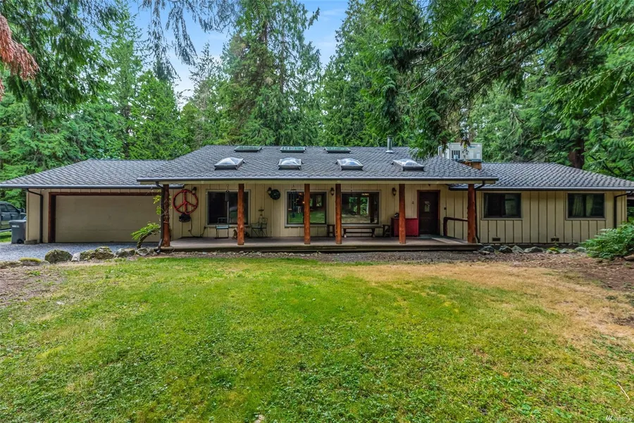 Escape to seclusion down a private wooded drive, where this Cabin-style rambler awaits on 5 acres while just 30 miles from Seattle. Tastefully updated, the open floorplan, vaulted ceilings, and charming loft create a warm and inviting atmosphere. You'll find beams, chains & bricks from the old Pier 99 on Seattle waterfront while the rustic appeal of reclaimed wood adds to the ambience. The oversized primary bedroom boasts a spa-like walk-in shower. Stay cozy by the woodstove in winter, and beat the summer heat with new efficient A/C. Unwind in the 300sf gazebo where deer often graze. Enjoy the convenience of a large 870sf insulated detached shop and RV/boat parking with carport. Embrace a harmonious life in this unique one-of-a-kind home.