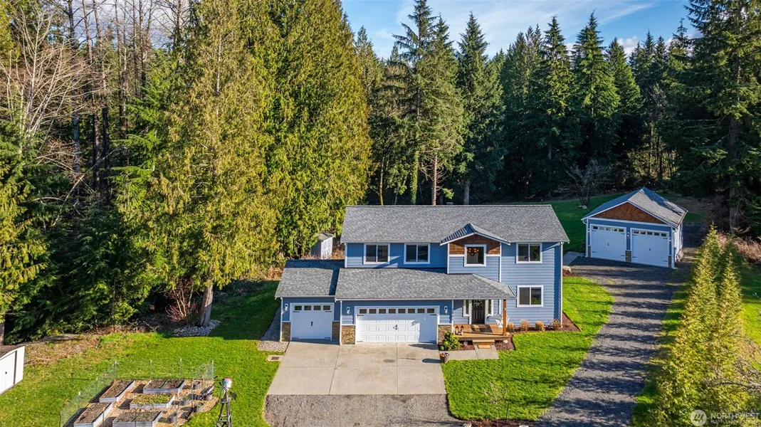 Five private acres in the Three Lakes area of Snohomish welcomes you to this custom-built modern farmhouse ultimate SHOP. It's a home where every detail has been thought of, making it ideal for those who appreciate style, comfort and the beauty of nature. The interior will impress with chef's kitchen, quality finishes & flexible spaces. Covered front and back decks, patio for grilling, fenced garden w/ planter boxes, large firepit, play structure, two sheds for tools/toys, and wired and ready for a hot tub, speakers, and entry gate w/ lights. A 24 x 30' shop has 3 -10' doors, epoxy floors, 4 windows, workbench, loft storage, additional lighting & its own 200amp panel. RV parking. It's crafted to enhance your best Snohomish lifestyle.