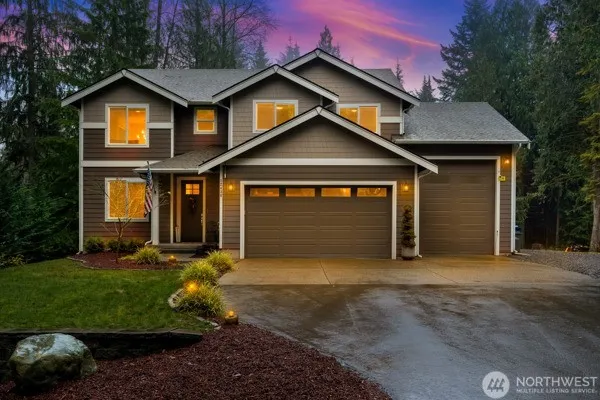 Nestled on five-acres in Arlington’s peaceful countryside, this 2020-built two-story home blends modern design with natural beauty. The open-concept layout features a cozy propane fireplace, custom cabinetry and built-ins, quartz countertops, crown molding, and luxury plank floors in the main living, kitchen, and dining areas. Enjoy added flexibility with a front flex room, custom mudroom, and a covered deck with tranquil evergreen views. Upstairs, find four spacious bedrooms, a bonus room, utility room and two bathrooms. The primary suite is grand in scale w/WIC & 5pc spa bath. An oversized garage accommodates four vehicles, inc. RV parking with a 12' door. With trails, woods, and no HOA, this retreat offers unmatched privacy and charm.