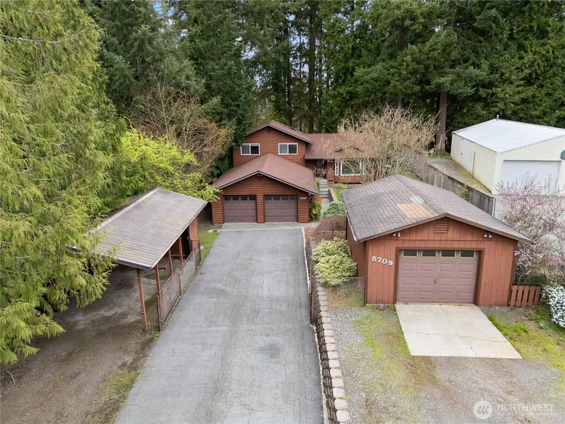 Price reduced! Set on a picturesque 1.25-acre lot with a park-like ambiance. This 2,320 sq. ft. residence offers 2.75 baths and a well-designed layout. Vaulted ceilings, bay windows on the main floor. Glass cooktop & SS appliances. 3 bedrooms up, including a primary suite w/private bath & deck. Lower level has separate-entry 2-bed apartment, great for multigenerational living or rental potential. New carpet in living room & bedrooms, kitchen has granite counters, access to backyard. Attached two-car garage, detached 1-car garage/shop, covered RV parking w/storageideal for tools & recreational toys. Landscaped yard features scenic trails. Shared utility room for both units provides convenience, can be locked for privacy between units.