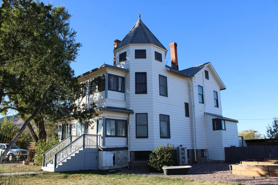 This historical 4700 square foot 3 story Queen Anne Styled Victorian house is on 2.5 lots (.4 of an acre). It has 4 bedrooms and 2.5 baths, 2 enclosed porches, and a full basement. Electricity, water, mini split heating, cooling, bathrooms, kitchen, and dining room have all been newly redone. There is a 1200 square foot adobe garage plus 1 carport. The large back yard includes stalls with pens. The large newly fenced front yard includes raised garden beds and various beautifully manicured flower beds.