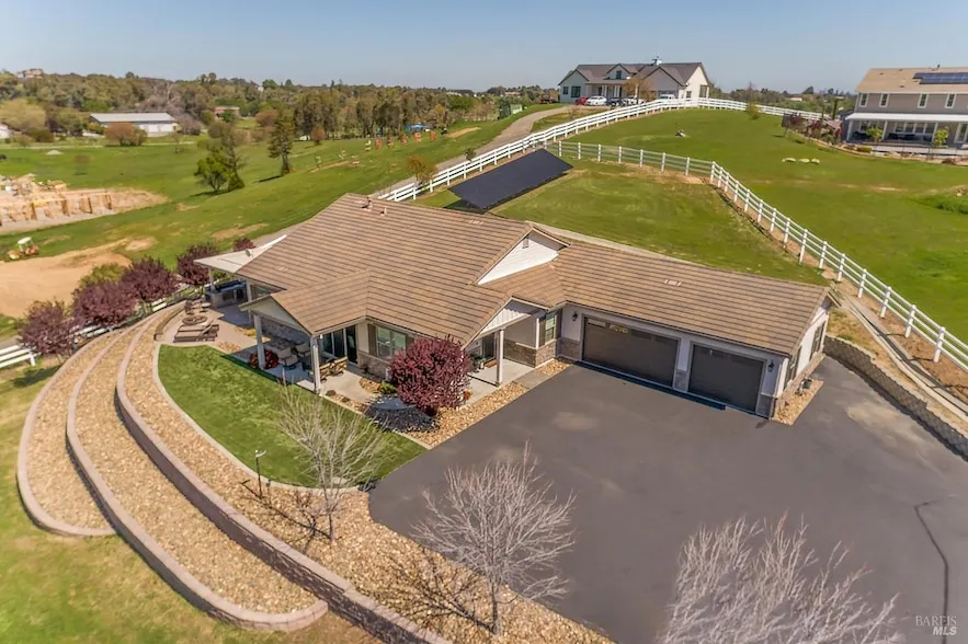 Absolutely stunning Country Retreat! Nestled on an elevated 2.5-acre lot, this gorgeous home offers 4 bedrooms, 2.5 bathrooms, and a spacious office with custom built-ins. The kitchen is a true centerpiece, featuring exquisite granite countertops, tile backsplash, abundant upgraded cabinets, and a roomy pantry. As you step inside, you'll be welcomed by soaring ceilings, an expansive great room, and breathtaking views through the numerous windows. Recently installed custom shutters add a touch of elegance. The luxurious main suite boasts an oversized soaking tub, a separate shower, and an impressive closet organizer that provides ample room for your wardrobe and shoe collection. The home also includes a whole-house fan for cooling off during warm summer days. The exterior is just as remarkable, with fresh paint (only a few months old), expansive covered patios complete with a fireplace and fire pit, and a fully equipped BBQ kitchen. The 2-year-old retaining wall adds to the property's charm. The 3-car garage offers generous space and overhead storage. To top it all off, the home is equipped with a 32-panel solar system and a Tesla battery backup for energy efficiency and peace of mind. This stunning home is truly a must see!