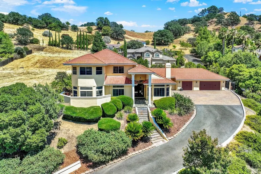 Custom home in the prestigious gated neighborhood of North Vine Estate. Gorgeous views of the hills. This 3976 sq ft home sits on just over a half acre and includes a main floor primary bedroom with a sitting area, fireplace and access to the backyard. Newly remodeled primary bathroom was just completed and finished with quartz countertops and shower, a freestanding tub, and completed with Moen hardware. Three bedrooms and two full bathrooms are located upstairs, along with a loft area located at the top of the spiral staircase. The kitchen is equipped with a 5-burner gas Wolf range topped with a stainless Kitchenaid hood as well as a double oven. Leading from the kitchen towards the 900 sq foot attached garage is a second entrance to the home and walk through pantry. In-ground saltwater pool with a cabo deck surrounded by travertine tile, a BBQ area with a TV and plenty of space for entertaining!
