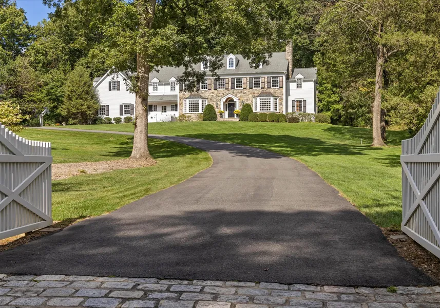 This pristine Custom Bucks County Colonial is perched on a picturesque 2 acre wooded lot. The river stone facade, authentic true divided light windows, wood louvered wrought iron hinged shutters, and beautifully lit cupola highlight some of the custom details of this unique property. Enter through the front driveway gates to the beautiful front entry or to the English garden with a stepping stone walkway and white picket fence to the service entry with Dutch door. Wide plank pine wood floors and an abundance of natural light add to the home's warmth and ambiance. The step-down family room boasts a large stone, wood burning fireplace with barn beam mantle and glass panel French doors to the large bluestone patio with knee wall. A French door opens to the library with custom woodwork and built-ins. Large living room has a wood burning fireplace, glass panel French doors and opens to the wet bar and powder room. The kitchen has beaded inset cabinets, spacious granite island and large dining area, as well as French doors leading to the blue stone patio. Adjacent to the kitchen is a butler's pantry, which opens to a formal dining room. Two staircases provide access to the second floor, which features a large primary suite, 4 additional bedrooms; 2 full baths; a laundry room and an oversized bonus room. Additional features include walk-up attic, a 3.5 car garage, full basement, and brick walkways. Basking Ridge School system. (Far Hills mailing address)