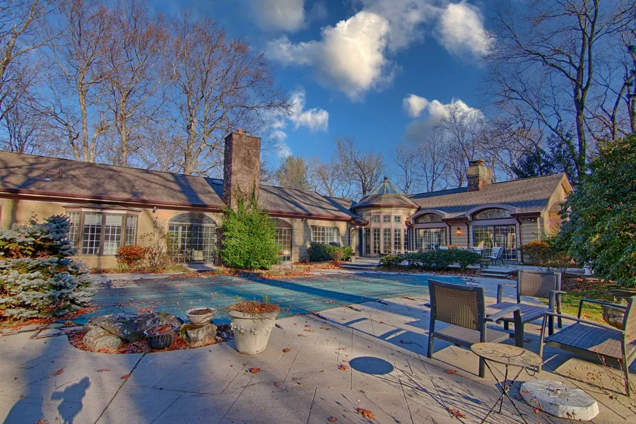 Elegant and expansive Ranch residing on five acres with generously sized rooms and an optimal layout for entertaining. Grand entry Foyer opens to the lavish living room with tile floors, wood-burning fireplace and an adjoining dining room with picturesque views of the backyard. The spacious kitchen with vaulted ceiling includes a sunlit breakfast room with wood floors and a spectacular circular skylight ceiling. Beyond the kitchen is the impressive Great Room with beamed cathedral ceiling, custom built-in cabinetry, a wet-bar, and a dual aspect fireplace which divides the space into a family room and a billiard room. The home features three comfortable bedrooms, each with beautiful bay windows and an en-suite full bath. The primary suite includes a luxurious primary bath with two walk-in closets, dual vanity stations and an over-sized stall shower. Homeowners will love spending the warmer months in the private backyard with paver block patios and an indulgent in-ground pool.