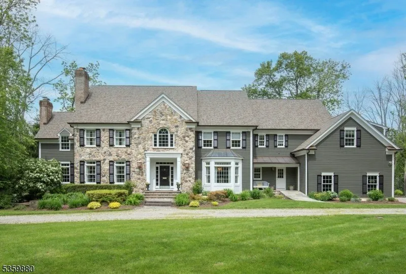 Privately nestled beyond a gated entry on one of Bernardsville Mountain's most coveted streets, this distinguished Bucks County-style Colonial offers timeless architecture and refined, updated interiors. Encompassing over 6,500 square feet plus a finished walk-out lower level, the home is both expansive and inviting. A gracious marble-floored foyer sets the tone for richly detailed living spaces where soaring ceilings, four fireplaces, and custom millwork evoke classic elegance. Recently refreshed with newly finished hardwood floors, designer lighting, and thoughtful updates, the home feels curated and current. Large windows frame views of 10 beautiful acres, drawing in light and connecting interior spaces to the pool, spa, and manicured grounds. The layout includes a vaulted family room, paneled library, butler's pantry, and spacious kitchen anchored by a 15-ft island ideal for everyday gatherings. The luxurious primary suite offers dual marble baths and a serene sitting room. With five bedrooms, multiple entertaining areas, and resort-like outdoor amenities, this is a rare opportunity to own a legacy home in one of New Jersey's most prestigious enclaves.