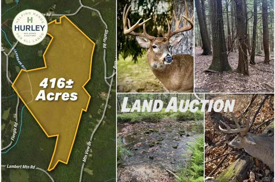 416+ACRES LAND AUCTION at Shaffer Mountain Rd, Cairnbrook, PA 15924 on Oct 24, 2025 @ 1pm. Situated in both Bedford & Somerset Counties just 1/2mile to STATE GAME LANDS #228! A Whitetail haven w/ abundant wildlife, trophy deer, bear, turkey! Flat to rolling terrain, extensive trail network, 3 STREAMS, lots of road frontage, breathtaking views, wild blueberry patches, mature timber: oak, maple, hemlock, cherry, birch, etc!