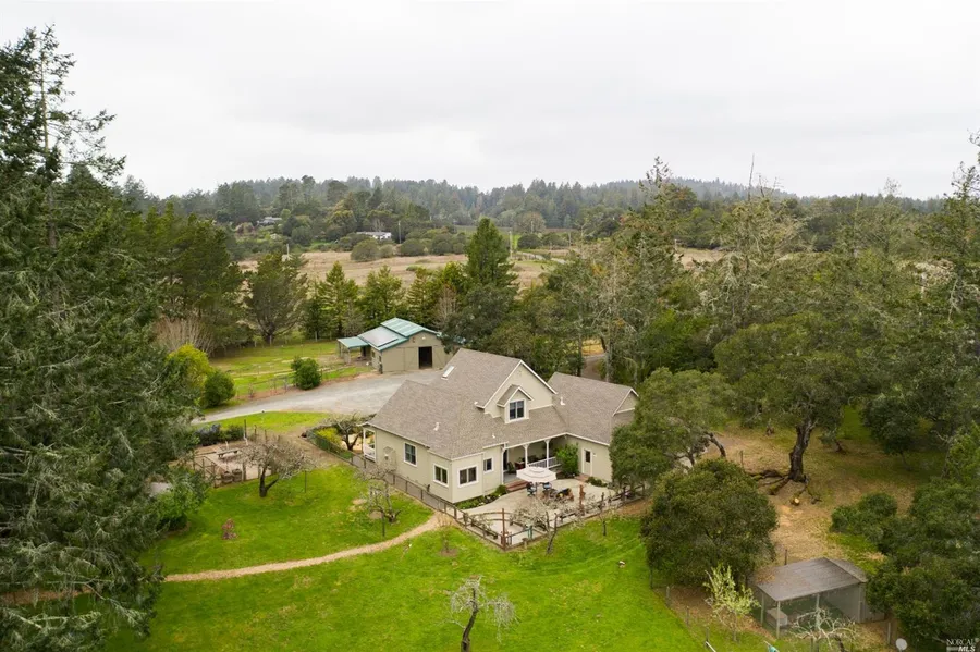 Welcome to the land of elegant country living! This superbly maintained 3/2.5 modern farmhouse and 1/1 granny unit, is nestled amid a hundred year old apple orchard + magnificent redwoods on 13 acres of exquisite beauty. An electric gate opens to a parklike setting which surrounds the home, granny unit, and barn. The entry opens to the living room, dining room with a cozy gas fireplace. The kitchen w/breakfast area allows one to relax in the morning sun and stroll to the covered patio. A spacious pantry/laundry room has access to the oversized 2 car garage, complete with an EV charging station + workshop. There are 2 bedrooms + a bath upstairs and the master bedroom/bath is conveniently on the first floor. In addition to the separate 1/1 granny there is a 5 stall barn w/paddocks + tack room, a huge artists/crafts studio. Plus ample water storage, solar power, generator hookups, fire protection and so much more. This property is truly an oasis of beauty, nature, and country living