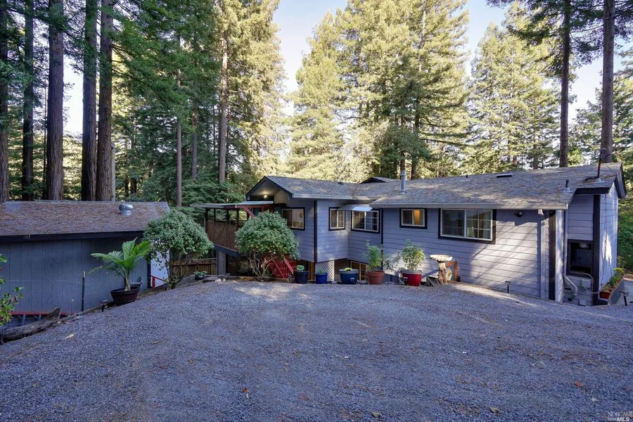 Delightful home with sun splashed decks among the redwoods! Ideal for multi-generational living having 2 complete living levels w/separate entrances plus access from the interior. Or enjoy the Russian River lifestyle by living in one unit, renting the other. Main level is 2bd/1ba, formal dining and office perfect for remote working/studying. Light filled kitchen w/granite counters, gas range, abundance of cabinets. Enjoy spectacular views of the redwoods while eating breakfast or casual dining. Charming family room with big picture windows and wood stove has a warm, welcoming vibe perfect for game nights, relaxing and creating lifetime memories. Great outdoor spaces include a sun splashed front deck ideal plus a covered deck off the sunroom. Downstairs is 2bd/1.5ba, kitchen, laundry, covered patio and separate entrance! Two sheds perfect for projects, storing kayaks, river toys. Plenty o...