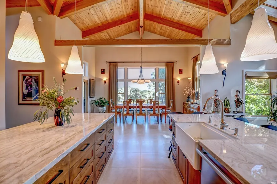 Welcome to Turtle Vines. This one-of-a-kind 2.86 acre estate is located on the edge of town. Walk down the Joe Rodota trl to restaurants, shopping & the Barlow. Elegant architecture of 3,684 SF will capture your attention with breathtaking beamed ceilings. Lives as Single Lvl 3B, 2.5B, 2 car main flr plus office, workout, LR, & bath lower. Barn style detached 3 car with beautiful 500SF guest studio apt above. No need to plan a vacation when you can swim in your salt-water solar-heated pool, soak in the private spa and sip wine from your own pinot vineyard. The chefs kitchen is sure to delight with Miele built-in appliances, two islands with Perla Venata quartzite counters. Raised garden beds & fruit trees allow for a farm to table experience for the chef in your household. This property has been meticulously maintained inc new roof, Furnace A/C. Addl features solar, generator, RV area & Sonic fiber. Relax next to the zen garden and take in the view from your Sebastopol sanctuary.