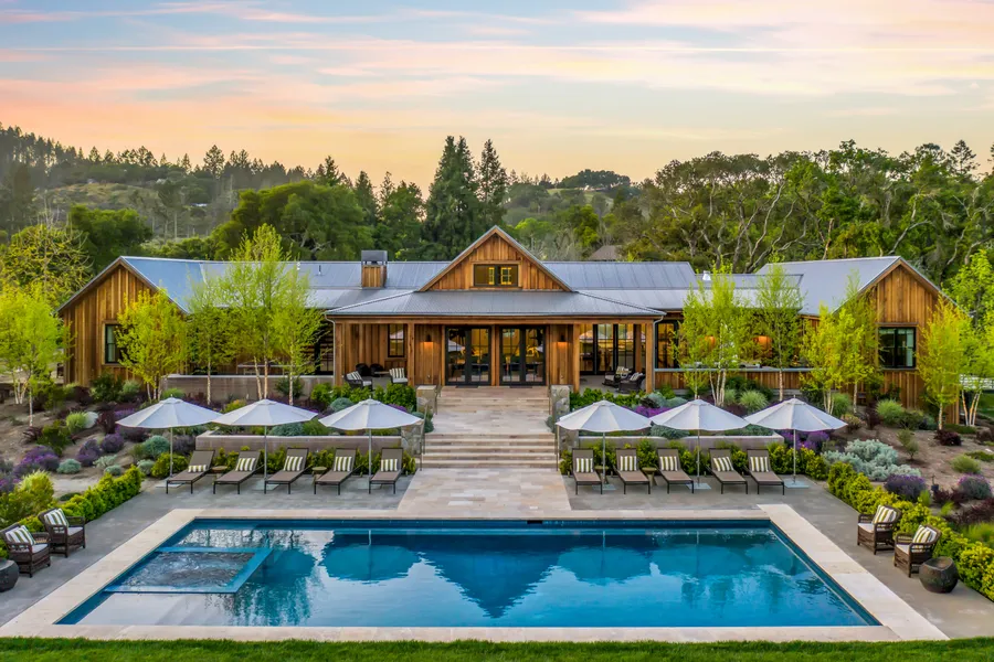 Newly built home (June 2019) by Landers/Curry Inc. and architect Chris Cahill. At the heart of this fabulous California modern farmhouse is a dramatic great room with open beamed cathedral ceilings and an incredible chefs kitchen with an expansive Neolith stone island, deluxe appliances, and a butlers pantry. Walls of Sierra Pacific doors open to an outdoor dining area, a covered porch, and a large, heated pool, hot tub, and lawn area. The interior features 4 bedrooms, 4.5 bathrooms, a media room with fireplace, laundry, and a 1 bed/1 bath guest cottage. The beautifully landscaped 5.96-acre grounds feature a Bocce court, security gate, solar panels, generator and room for more. This property has been meticulously designed and outfitted with the most luxurious finishes to create a unique haven for entertainment and relaxation. Located in the heart of picturesque Kenwood, in close proximit...