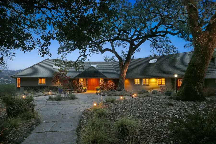 This gated residence, sited on one and a half acres, is framed by majestic oaks, while featuring the most jaw dropping views of Sonoma Valley including Hood Mountain, Sugarloaf, polo fields, & Ledson Winery. An easy indoor outdoor flow invites one from the remodeled kitchen and or common area rooms directly onto the large tile veranda...ideal for al fresco dining and entertaining. The eat-in kitchen boasts top of the line appliances including Miele annd Thermadore...a chef or baker's delight. The mostly single level abode offers an oversized master/ primary suite on the main floor, and offers walk-in shower, jacuzzi tub, and his-and-her walk-in closets. A second view-infused en-suite bedroom completes this floor, while upstairs, a third en-suite bedroom & tv room can be found upstairs. Across the way one finds a private 1BR guest house / ADU, also laden with views, private patio, gas fireplace, kitchenette. Bonus features include 3 car garage, generous storage, hard-wired generator.