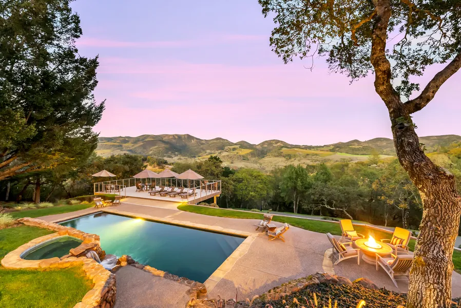 Tucked into the hills just above the Sonoma Plaza in an area of vineyard estates, this breezy residence is a delightful getaway with enviable views and a wealth of welcoming spaces. 3 bedroom, 2.5 bath (1br, ba & office up) features style and functionality enhanced by views throughout. Great work space with two offices. Outdoor entertaining and play aside the pool with waterfall, lawn, sport court and expansive entertaining decks. Pool house with theatre offers room for guest overflow. Peaceful approximately 5.72 acres is private yet only an hour from San Francisco and just above the Sonoma Plaza.
