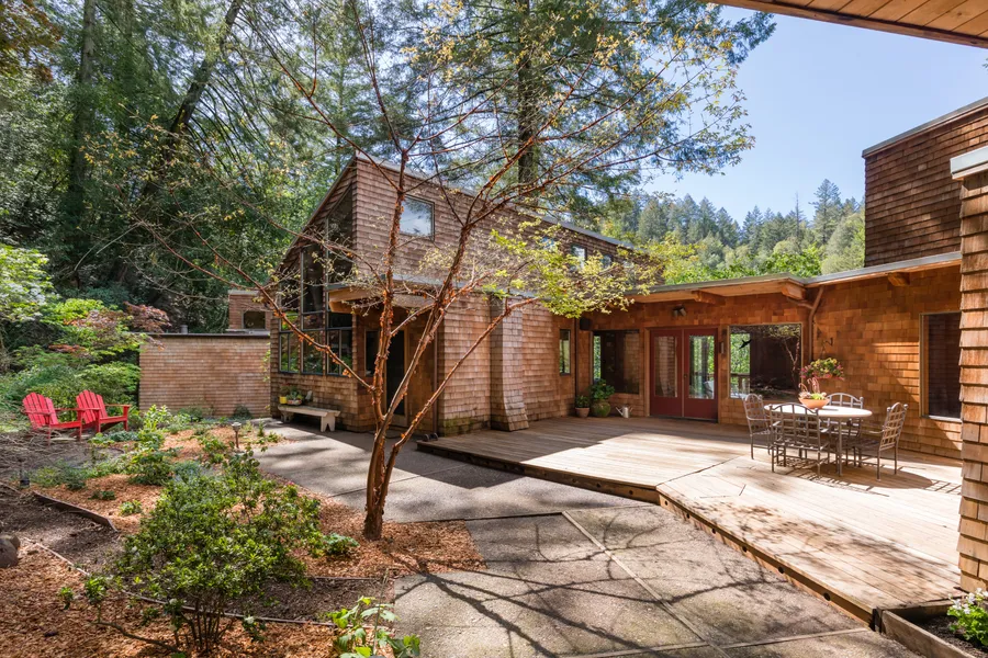 Designed by architect John U. Clowdsly Jr, the style is a contemporary inspiration of nature and light. The building materials include substantial redwood beams, clear redwood paneling, exposed aggregate, slate and reclaimed wood flooring. Clad in cedar shingles, its unlikely this quality would be matched today. Environmentally friendly and efficient radiant heat in addition to forced air, ensure comfort throughout. A newer metal and torch down roofing system add to the quality of construction. Vistas from the floor to ceiling windows welcome daylight and stars, lifting vision and spirit.