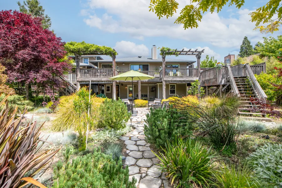 Enjoy the best of indoor-outdoor living at this beautiful Russian River haven in an idyllic setting with vineyard views. Host fabulous gatherings or retreat from 2022 in this spacious home complete with two wings - each with two bedrooms and full bath as well as an office/art studio space gleaming with natural light. The main living room boasts a stately fireplace with hardwood floors and a seamless connection to the outdoor deck through glass doors. The view below is a transcendent garden space that has been meticulously landscaped. Take in the tranquil scene of the expansive vineyard just beyond the property, without the messy hassle of actually stomping grapes. An easement allows you to pick from the many fruit and walnut trees between the space.