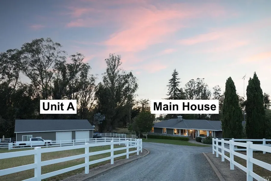 Located at the end of a long driveway, this beautiful country property on 2.5 acres with two separate living spaces and an RV sized shop is a dream come true! The main house offers a flowing layout with open concept living room, family room with soapstone wood stove, formal dining room, breakfast nook off the kitchen, and spacious bedrooms including primary with ensuite bath and slider to a hot tub on the back deck overlooking expansive country views. An attached 2-car garage has laundry and on-demand water heater. Detached building at the bottom of the hill has a spacious 2/2 living unit with a full kitchen, a primary bedroom suite, in-unit laundry, and a fenced side-yard with decking. In addition, there are two huge shop/storage spaces each with a commercial-grade roll up door that can accommodate the height of most RVs offering plenty of space for your projects, vehicles, farm equipme...