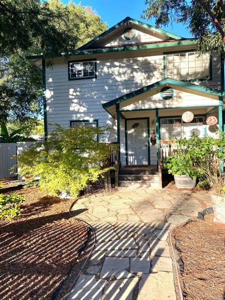 Two charming houses on a lovely half acre lot in downtown Cloverdale! Feels like country with beautiful redwoods and other mature trees lining the property for cool summer shade and many sunny open spaces perfect for gardening. Rare opportunity for extended family compound or rent one home for added income and live in the other, plus plenty of room to add studio or playhouse. Front house is 2 story freshly painted inside with an open flowing floor plan, lots of natural light and 3 bedrooms, 2 baths, gleaming bamboo wood floors and tiled bathrooms. Newly completed trim throughout. Primary bedroom with sitting area and bathroom upstairs. Enjoy two lovely decks from living area and kitchen for easy access to the outdoors. Back house has a covered carport and is a charming vintage single level home, with beautiful hardwood floors, 2 bedrooms, 1 bath, indoor laundry, country kitchen and a dec...