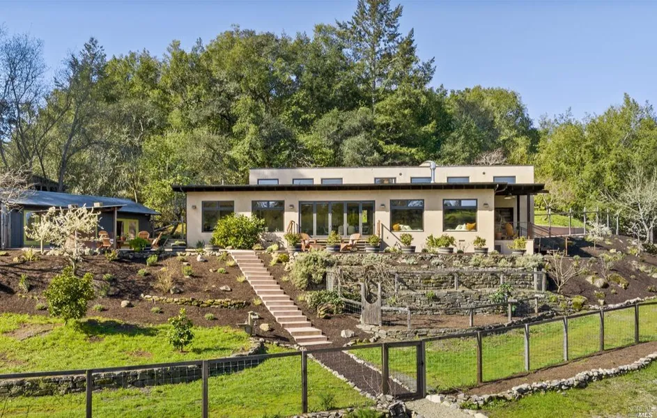 Located in the rolling green hills of West Sebastopol, this nature-inspired, split-level 2,080+/- square foot masterpiece home is nestled on a 1.3+/- acre private park-like setting with an abundance of fruit trees and a rushing winter creek. The contemporary architectural design showcases a stunning 15ft. wall of glass that folds back to create a magical blend of indoor and outdoor living. Completely reconstructed in 2009, this one-of-a-kind home boasts high ceilings, acid-washed concrete floors with radiant heating, custom industrial steel and bamboo cabinetry, concrete countertops, high-end copper and bronze fixtures, and reclaimed lumber. Two bedrooms each boast their own tiled bathroom, which one includes a large rain-shower and the other an oversized copper bathtub. Additionally, there is a living roof, pool, spa, detached outbuilding, and a yurt cabin suitable for an office, meditation space, guest room, or an art studio. Enjoy all this just minutes from the artisan shops of downtown Sebastopol and the sandy beaches on the magnificent Sonoma coast.