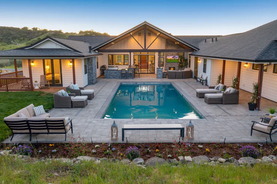 The main home spans an impressive 2792± square feet and revolves around a glistening pool, a covered outdoor kitchen, and an entertainment area that will leave you speechless. Inside, indulge in the luxurious features including 3 bedrooms, a perfect work-from-home office, 3 full luxurious baths, and a great room with vaulted ceilings.
