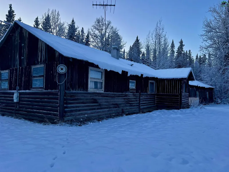 2-bed, 1-bath log home with Richardson Highway frontage on 4.5 acres. Property features both an attached garage and a detached garage. Home has a private well and septic system; condition of both is currently unknown. Build year and square footage are estimated.