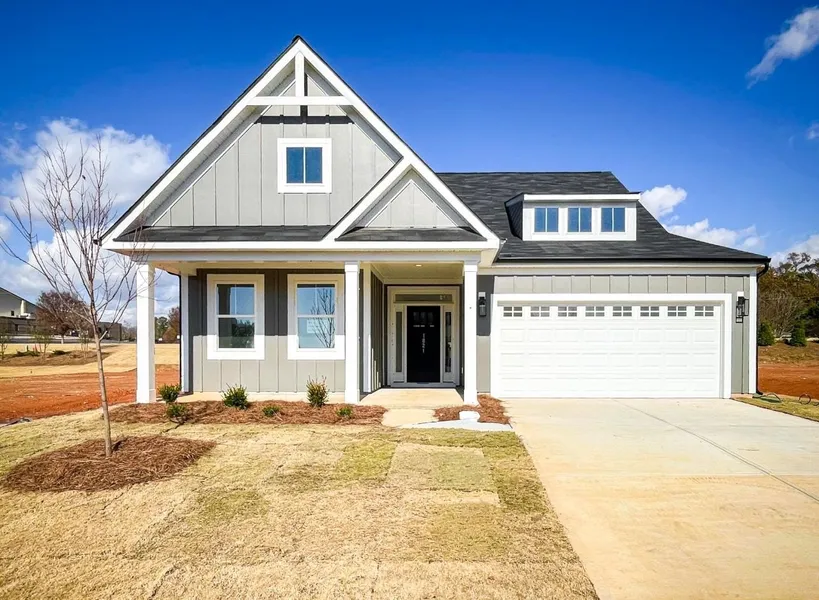 New construction. 4 bedrooms, 3 bathrooms, large open loft, and a rear covered porch. The main level includes a foyer leading to the open living area at the back of the home. The great room features large windows for natural light. The kitchen includes upgraded cabinetry, quartz countertops, tile backsplash, stainless steel appliances, LED disc lighting, and pendant lights over the island. The adjacent dining area provides access to a covered rear porch and an additional patio for outdoor use. The primary bedroom is on the main level and features a bathroom with a tiled walk-in shower, garden tub, dual sinks, and tile flooring. A laundry pass-through connects to the primary suite. Upstairs includes a large loft, fourth bedroom, and third full bathroom. All bathrooms feature quartz countertops. Additional upgrades include enhanced vinyl plank flooring, upgraded lighting, plumbing, and trim packages. Structured wiring and built-in pest control system included. Finished garage is drywalled, painted, and includes electrical outlets and lighting. Community amenities include two pickleball courts.
