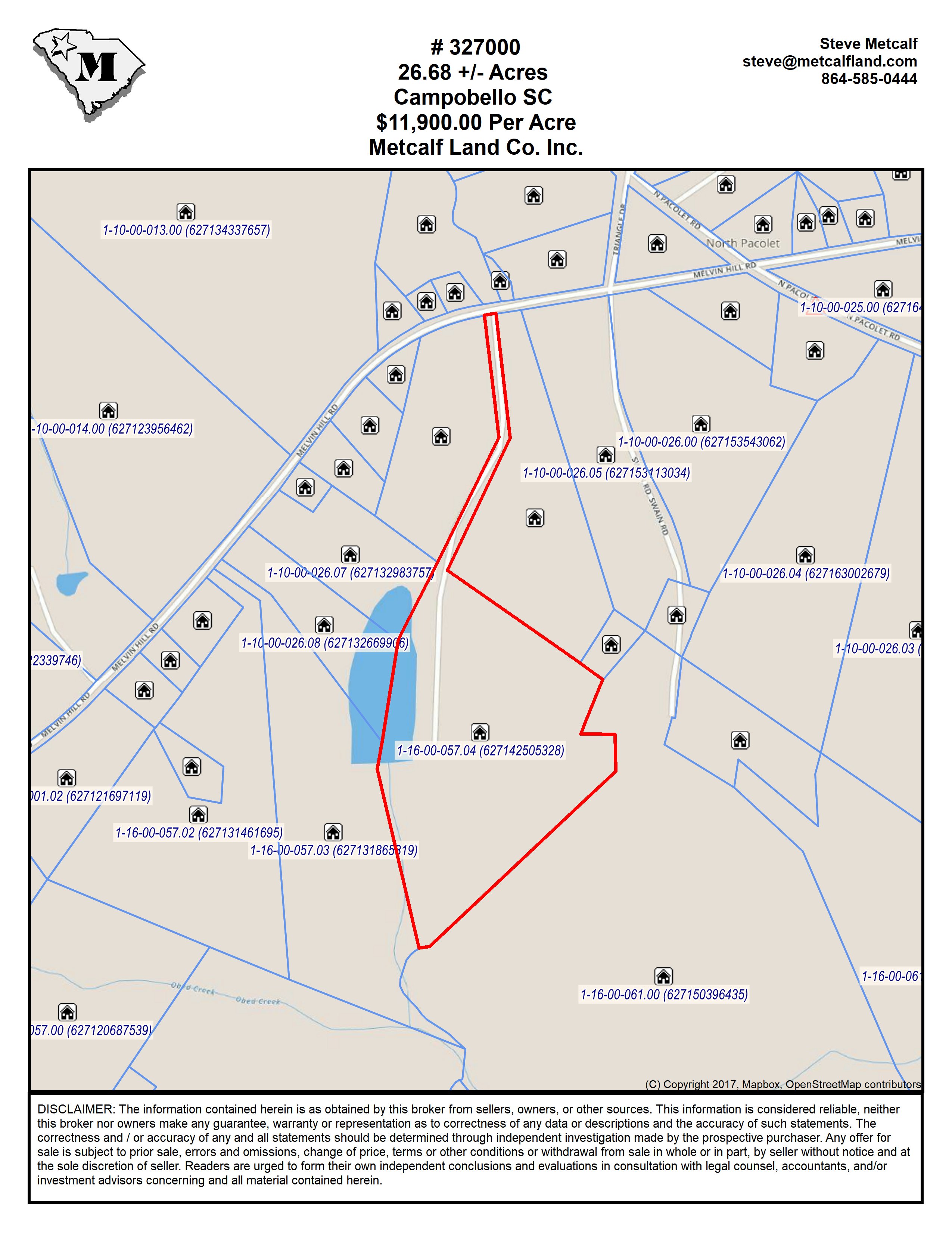 Research Parcel InformationI-26 West to SC Highway 11 exit. Turn right onto SC Highway 11 then left on East Frontage Rd. (Just past the truck stop.) Then right onto Melvin Hill Road. Property is on the right before the North Pacolet Road intersection.