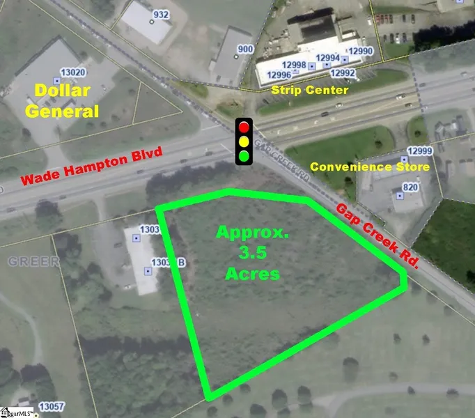 Extremely high traffic Wade Hampton Blvd. commercial corner at the signalized intersection of Gap Creek Rd. with approximately 300 ft. of frontage along both roads. This 3.5 acre site is suitable for numerous development opportunities such as a convenience store, strip shopping center, restaurant, or stand alone business. This property is within the Greer City limits and has potential for all utilities.