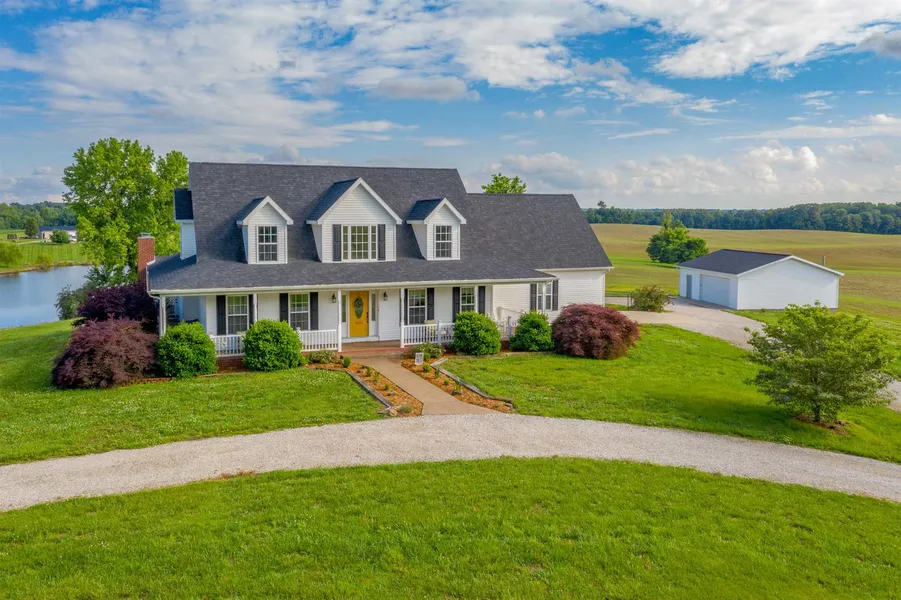 This beautiful 5.99 acre property has stunning views of the lake from the back of the home. As you walk to the front door, this beautiful 1.5 story home greets you with a covered front porch and then a large entry foyer. Looking straight into the living room and through the family room windows, you see the beautiful view of the lake. Off the main entry is an office/dining room and then you will head into the kitchen. With lots of counter and cabinet space, this beautiful kitchen has an eating area with windows overlooking the yard. The living room has vaulted ceilings and looks out into the family room. The family room has an amazing view of the property, a large brick fireplace, and an additional cooking/bar space with a mini fridge, wine cooler, small sink and is completed with stunning Brazilian granite countertops. The master bedroom is on the main level and has 2 closets (one is a very large walk in closet) and a master bathroom with a walk in tile shower. The main level also has a guest half bath. Upstairs you will find the 2 additional bedrooms, full bath, and a large bonus room. 2 car attached garage and a 2 car detached garage w/ heat. Geothermal HVAC system. The views of this property are hard to find! Don't miss this stunning property!