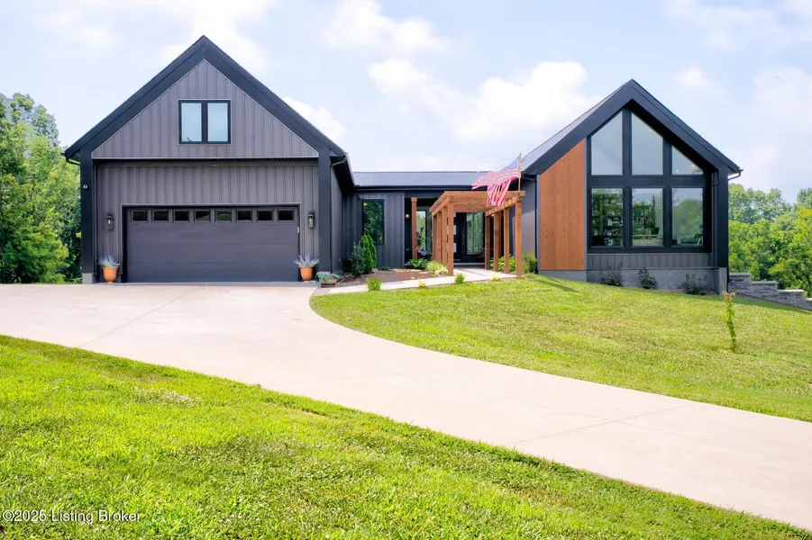 Prepare to be WOWED with this unique and stunning 3 year ''new'' home. Built by Schumacher Homes and completed in December of 2022, this open plan is an entertainer's dream, both inside and outdoors. Located in Spencer County on a private 9 acres, this home features an incredible outdoor space which includes a 20x40 in ground pool with pool deck entry and slide, pool house, full bath house, pavilion with refrigerator, covered back porch with vaulted wooden ceiling, and stocked pond. Coming up the drive, one will be impressed with the curb appeal of this home. The pavers walkway to the covered front porch is highlighted by a stained wooden pergola that complements the dark siding of the home. A real standout. The front door blends in with the modern style of the home. Once inside, you'll notice that this plan was built with views to the outside as a priority. Large windows everywhere floo...