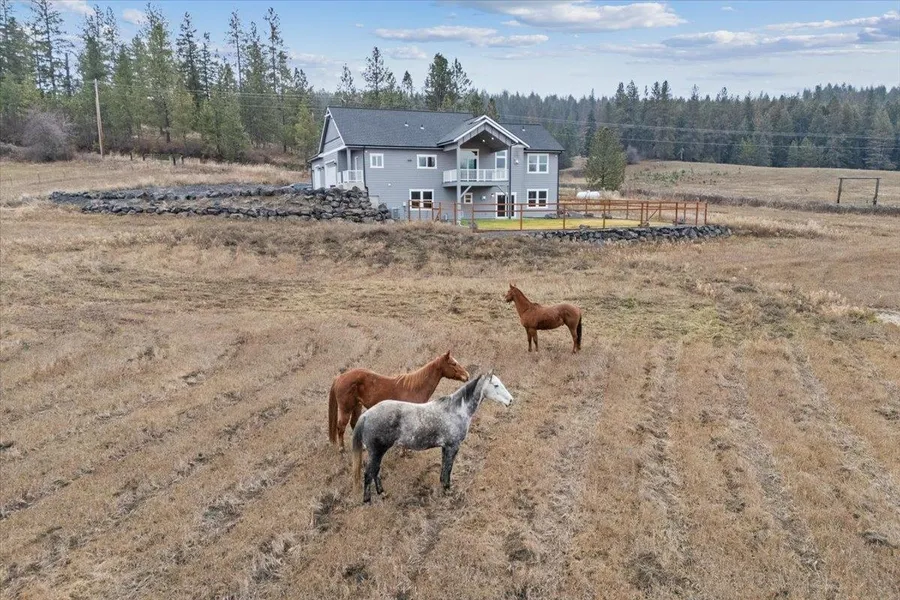 This exceptional home on 16.3 fully fenced acres offers clean-lined style & sweeping views. Special features include two primary suites, each designed as a private retreat, plus a 500 sq ft heated, air conditioned studio that is perfect for artistic pursuits, woodworking or other projects. The inviting great room with gas fireplace & sliding doors opening to an expansive covered deck offers the perfect space for relaxation or entertaining. The gourmet kitchen shines with granite countertops, custom cabinetry, Bosch appliances & a/ large walk-in pantry. A versatile den with French doors adjoins the great room. A mudroom with outside entrance adds convenience. The lower level features a media room with a cozy propane stove plus a guest bedroom & 4th bath. Other features include a gated entry, security system, Starlink, fenced backyard, RV parking & hay-producing pastures with room for a future barn, shop or equestrian setup. Easy paved road access in a pristine setting.