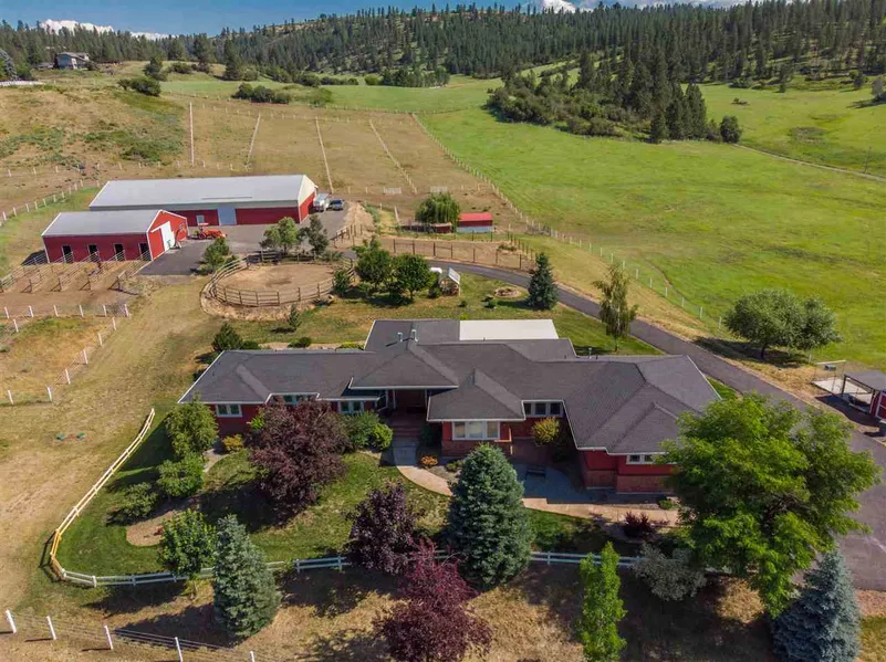 Gated equestrian estate with territorial views. This stunning property offers panoramic views of the Peone Prairie and surrounding mountains. Multiple buildings allow for a variety of uses including barns, shop indoor and outdoor arenas. The nearly 6000 sqft home features rooms on a grand scale with box-beam ceilings, hardwoods, elaborate tile work and HUGE chefs kitchen. Three car garage, paved drive and 2 parcels totaling over 25 acres. This is an amazing property!