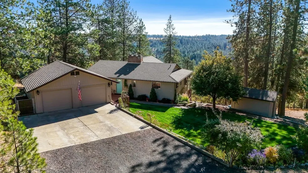 Welcome to your private retreat, 15 minutes from Downtown Spokane and the airport! Nestled on 3.66 peaceful acres with stunning scenic views, this charming ranch-style home offers the perfect blend of country living and city convenience. You ll love the spacious living room with soaring cathedral ceilings, two cozy fireplaces, and large windows that frame the serene landscape. The kitchen is designed for the home chef, with abundant counter space and cabinets. The oversized Primary Bedroom has plenty of room for a home office or bonus space ideal for today's flexible living needs. Downstairs you ll love the cozy family room, another bedroom, your very own sauna, and large workshop that could easily be converted into additional bedrooms, Outside, you ll find a fenced yard area to keep pets safe, a huge deck to soak in those breathtaking sunsets, and a powered, insulated shed with a roll-u...