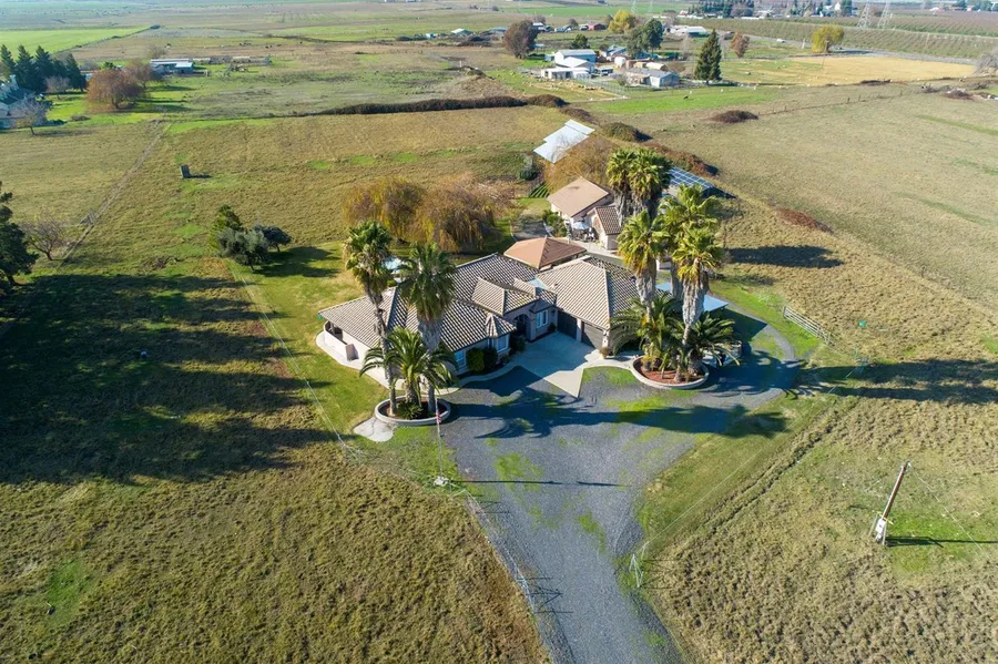 Welcome to this serene beautiful modern Mediterranean 2500 sq. ft.custom home on a gated 4.7 acres. This lovely home features an open floor plan, large kitchen with 10 foot island with travertine counter top,walk-in pantry, formal dining room, laundry and mud room. Floors are stained concrete, perfect for country living. You must see this Master Suite with walk-in closet, en suite with double walk-in shower, double vanity, make-up vanity, bidet and french door to raised wood deck with a hot tub.Second bedroom has en suite with walk-in shower. From this amazing home you walk out to a Pergola with an outdoor kitchen, built-in barbeque, fireplace and ample seating and storage, 16'x 12' Greek fountain. Out buildings include an insulated shop with 1/2 bath, easily converted to an in-law quarters;chicken house, covered tool and firewood storage. Property is fenced with irrigated pasture, pole barn and corral. RV parking with water,sewer, electrical available. A MUST SEE!