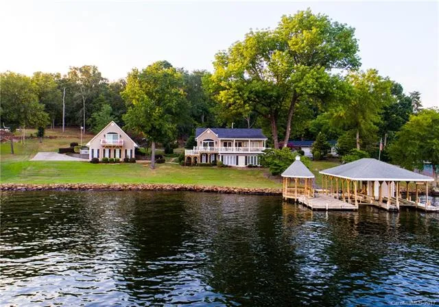 Beautiful waterfront setting with over 250' waterfront, has long-panoramic views of the lake and the Uwharrie Mountains. Home contains four bedrooms and two baths, large great room with cathedral ceilings and wrap-around decks. Large master was added with workshop basement underneath. A new heatpump was added October 5th. The dream garage with 2 heat pumps contains a commercial kitchen with custom cabinets. 1/2 bath downstairs and 1 full in upstairs apartment and balcony overlooking the lake.