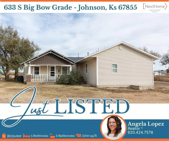 Imagine waking up in the peaceful Kansas countryside, coffee in hand, watching the sunrise stretch across your land while your animals start their day. Just 10 miles from Ulysses, this cozy 5-bedroom, 3-bath home offers 3,700 sq ft with an inviting open layout, an eat-in kitchen, a warm living room, and a formal dining room perfect for gatherings. The original 1950 home blends beautifully with a spacious 2016 addition. With nearly 4 acres there's plenty of room for horses, cattle, or 4-H animals plus a barn to keep them out of the elements. Enjoy quiet country living, and the convenience of being close to town. In the evenings, relax on the porch and watch those unforgettable Southwest Kansas sunsets settle over your acreage. This is cozy country living at its best. Call Angela Lopez @ 620.424.7578 for a showing.