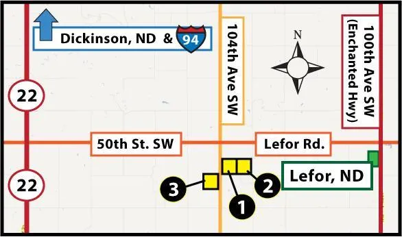 Research Parcel InformationProperty Directions: Proceed south of Dickinson, ND on ND Highway #22 to 50th St. SW (Lefor Road) then west 6 miles to 105th Ave. SW, then mile south.
