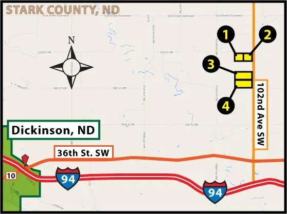 Research Parcel InformationFrom the Intersection of I-94 and Highway #10 in Dickinson, North Dakota go 6 miles east on Highway #10, then 2 miles north on 102nd Ave. SW. This will take you to the southeast corner of the property.