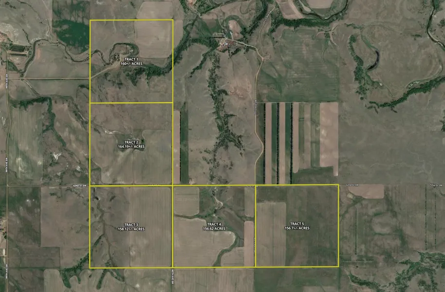 This 156.7 +/- acre tract has 45.69+/- acres of tillable cropland with an outstanding Productivity Index (PI) of 74.69. There are 109.63+/- acres of grass and hay with a Productivity Index (PI) or 50.05. There is access along the entire North side via 42nd Street SW. Anyone looking to put up more hay and acquire additional cropland in the process will benefit from this tract.