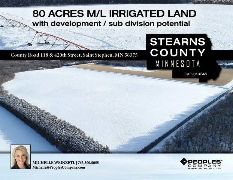 Peoples Company is pleased to present this diverse investment opportunity: 80 acres m/l approximately one mile from the city limits of St. Stephen, MN. This tract offers 76 acres of prime irrigated cropland carrying a CPI of 82. This tract lies adjacent to a subdivision featuring five acre wooded lots in close proximity to St. Stephen. Accessible from County Highway 2, County Highway 118, and 420th Street, this tract could offer a beautiful spot to build your dream home. In the northeast corner, you will find roughly five acres that are heavily wooded and offers great whitetail hunting and desirable habitat for turkey and pheasants. The seller is willing to subdivide the 80 acres if there is a buyer interested in a smaller tract. Additionally, the current tenant is willing to lease back the land for those looking for a hands off investment opportunity. So if it's land to develop, farm, invest in, or build on, this opportunity is worth checking out! Prime 1031 exchange property with upside potential capturing capabilities.