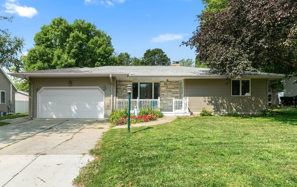 Location! Location! Location! Wonderful 3 bed 2 bath home close to schools, biking trails, golf course, restaurants, & parks. The desirable ranch style layout offers a semi-open floor plan giving this very spacious home a cozy intimate feel. The home features a maintenance free wrap around deck just off of the 3-season porch, and a covered porch on the front of the home. Large lot with ample shade from its mature trees. Updates include: new water management system installed summer 2022. Lifetime warranty of the structure transfers to new owners. New water heater and new refrigerator in 2022. New carpet in sunroom & new roof installed Sept 2023.