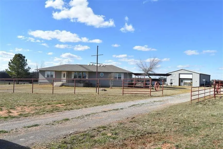 Beautiful 3 bedroom 2 bath 1820 Sq. Ft. house built in 2006 nestled comfortably on a mixed use residential, ranchland 24 acre property in Stephens County, outside of Comanche, OK 73529. The entire great room is open concept - living room, dining room and kitchen. The home is total electric except for the wonderful propane gas fireplace situated in the living room. The dining room has a massive built-in hutch. The appliances are stainless steel and will convey with the home. French doors lead onto a nice enclosed sun porch, perfect for viewing the lake, livestock and wildlife, and accessing the back patio. The covered front porch also affords views of the lake and the pasture at the front of the property. Whitetail deer are known to graze and play in the front pasture, waterfowl enjoy the pond, and Golden Eagles decorate the sky with their grace. The Corps of Engineers owns and maintains ...