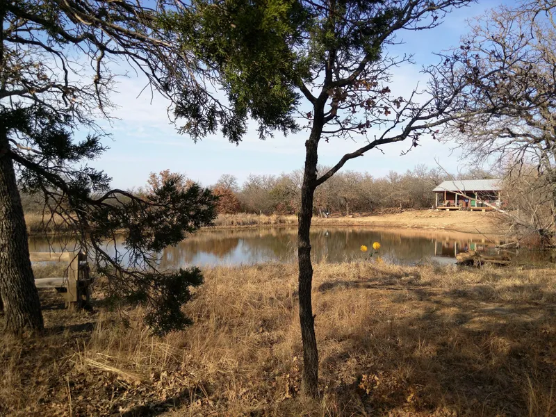 Approx. 17 acres of meticulously cared-for land with cleared walking paths for nature hiking. Mostly oak with little mixed cedar. Big STOCKED tank with lots of large bass and even ducks in season. Plentiful wildlife! Dirt backstop for pistol range. Buried electrical up to cabin. Good fencing. Septic tank. Cabin has 2 rooms and bath with kitchenette. Gravel road entrance. Water well gets 15-20 gpm. Looks like a park. Only hunted once in 5 years.