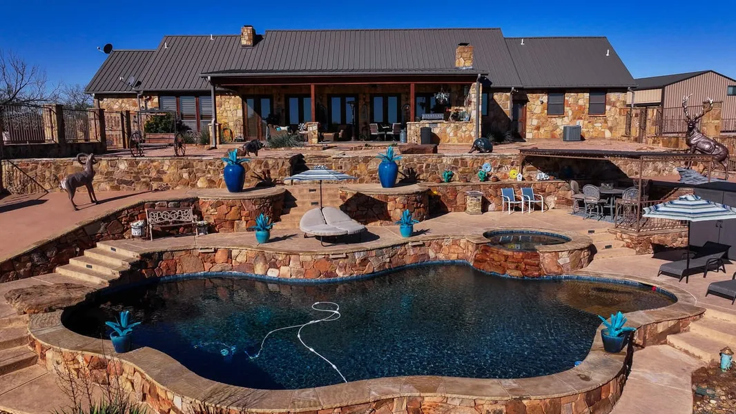 At the heart of Buck Canyon Ranch is an extraordinary custom stone residence that beautifully combines modern comforts with rustic elegance, creating a genuinely appealing atmosphere. As you step inside, you will be captivated by the meticulous craftsmanship that defines the open floor plan. This thoughtfully designed layout harmoniously connects the kitchen, dining, and living areas, adorned with floor-to-ceiling windows that showcase stunning sunrises and fill the home with natural light. Every detail shines here, from the custom cabinets and expansive island to the exquisite granite countertops and charming exposed wooden beams. Two cozy rock fireplaces enhance the sophisticated ambiance. At the same time, the two bedrooms, connected by a convenient jack-and-jill bathroom, warmly welcome guests. The primary bedroom suite is a delightful retreat, showcasing spacious his and her closets, a luxurious double sink vanity, and a relaxing Jacuzzi tub. Perfect for entertaining, the backyard offers a sweeping view of the landscape to the east, which overlooks a pristine swimming pool surrounded by impeccably manicured grounds. This is a delightful oasis to call home!